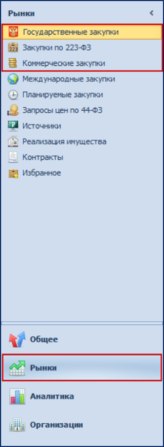 Для поиска актуальных закупок перейдите в раздел «Рынки» и выберите один из его подразделов. Основными подразделами для поиска текущих закупок являются: «Государственные закупки», «Закупки по 223-ФЗ», «Коммерческие закупки».