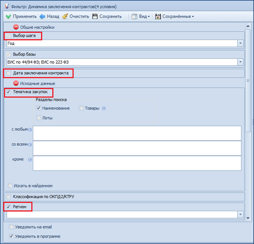 Для этого вам достаточно заполнить поле «Тематика закупок», интересующий период и выбрать шаг графика (месяц, квартал, год). Также вы можете указать интересующий регион.