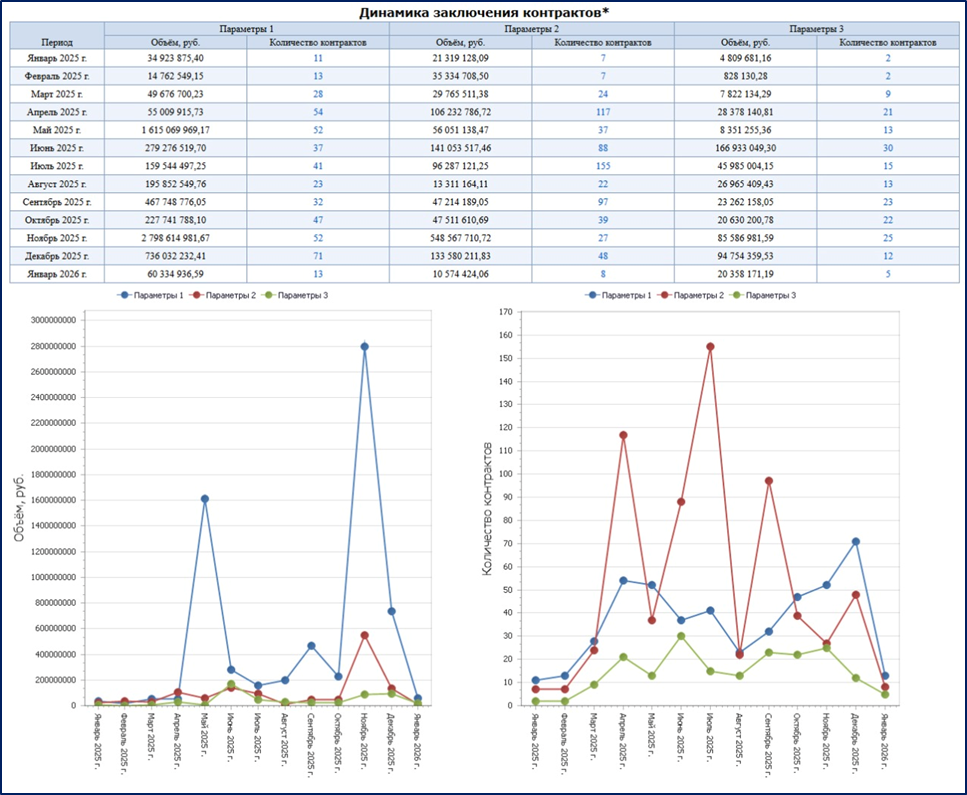 В модуле «Аналитика» вы можете изучить динамику по объему и количеству закупаемых товаров и услуг. Для этого воспользуйтесь отчетом «Динамика заключения контрактов».
