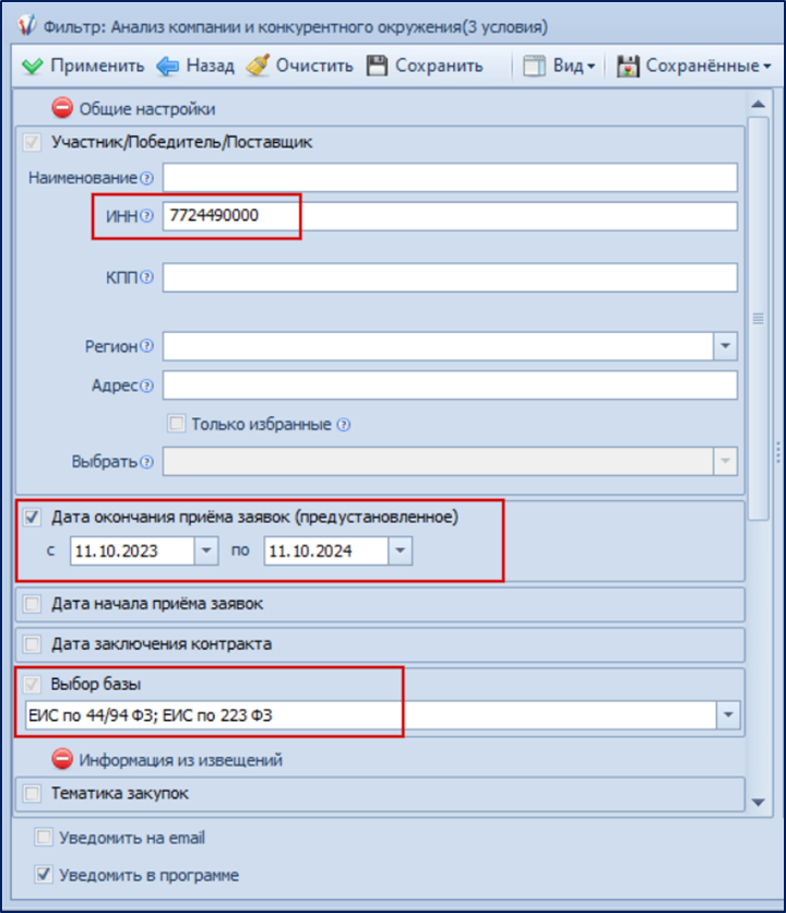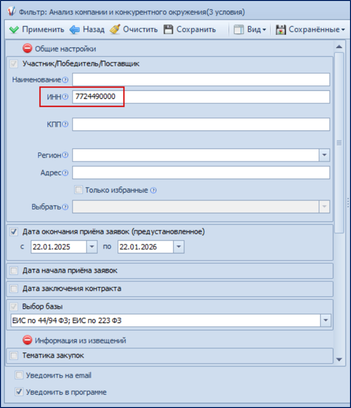 Чтобы построить отчет, в фильтре “Участник / победитель / поставщик” укажите ИНН интересующей организации (например, своей или компании-конкурента). Выберите нужный временной интервал, принадлежность к 44-ФЗ, ПП РФ 615 или 223-ФЗ.