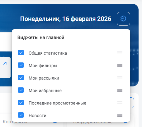 Главная - ваш персональный настраиваемый дашборд. Здесь собрана статистика по всем данным в продукте, а также виджеты с вашими сохраненными фильтрами, рассылками, избранными и просмотренными закупками, последними новостями. Виджеты можно настроить в нужном порядке или скрыть лишние.