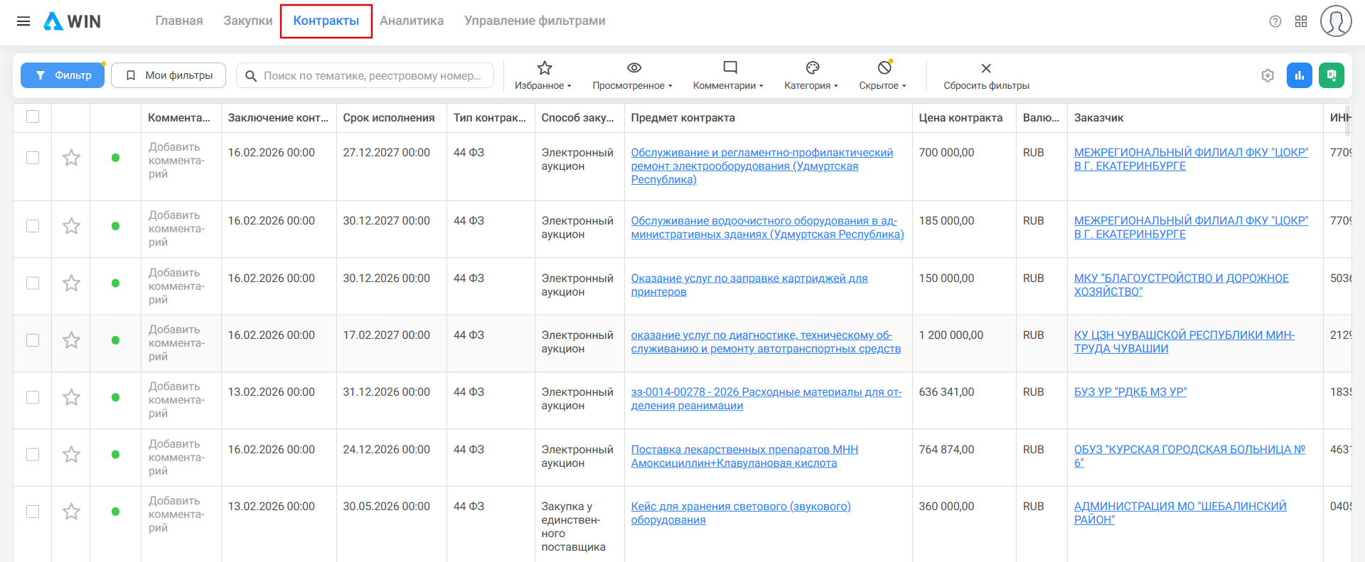 Контракты - раздел с базой контрактов по доступным федеральным законам за текущий и два предыдущих года.