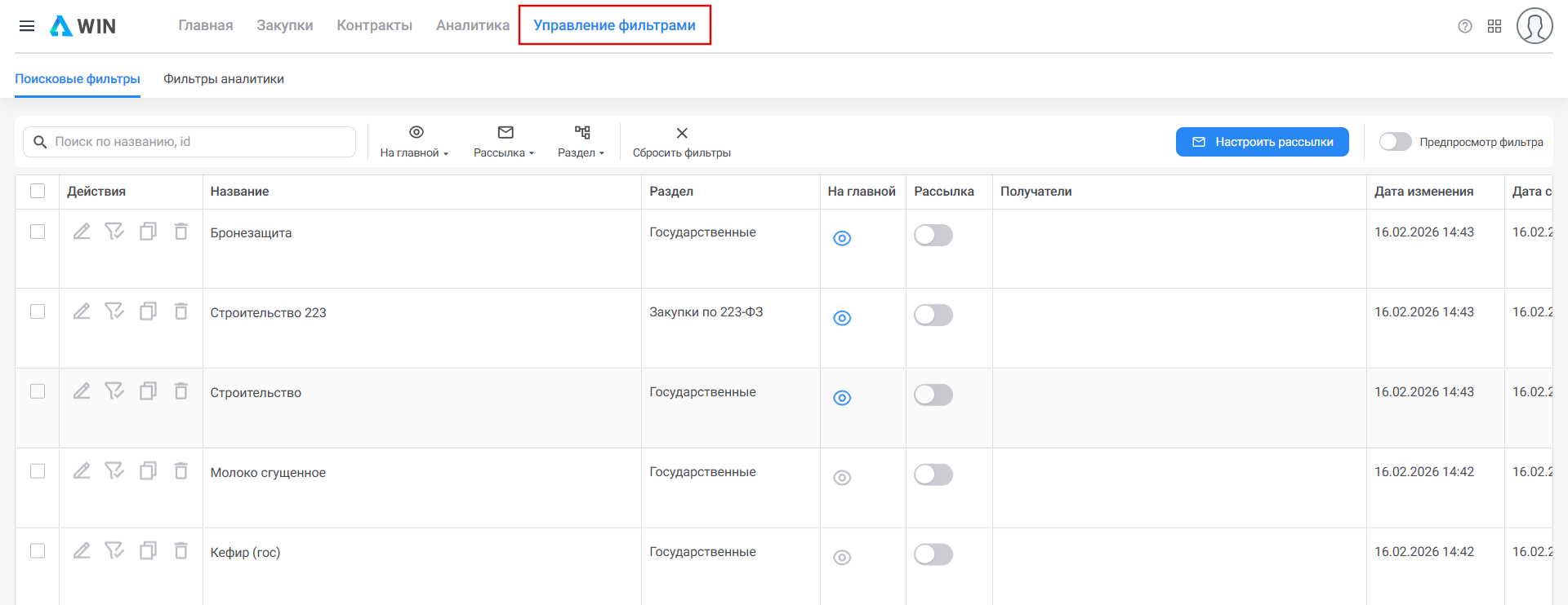 Управление фильтрами - единый раздел для настройки всех ваших сохраненных фильтров. Здесь вы можете их редактировать, копировать, добавлять на Главную или включать в рассылку.
