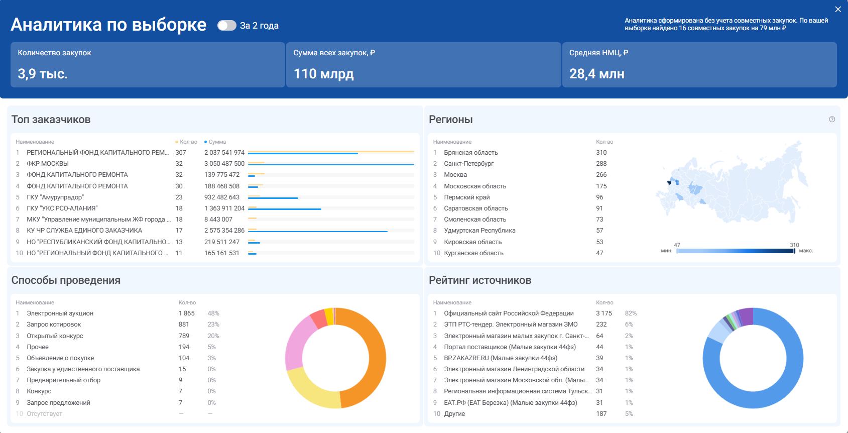 Показатели: Отчет «на лету» включает графики (например, динамика закупок), сводные таблицы и основные показатели (количество и сумма НМЦК).