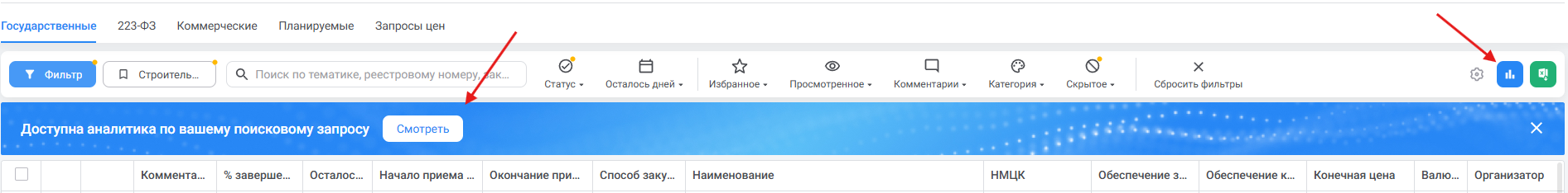 Как перейти: Над таблицей баннер «Доступна аналитика по вашему поисковому запросу» или кнопка «Аналитика по текущей выборке».