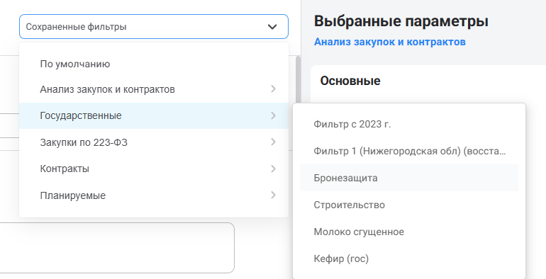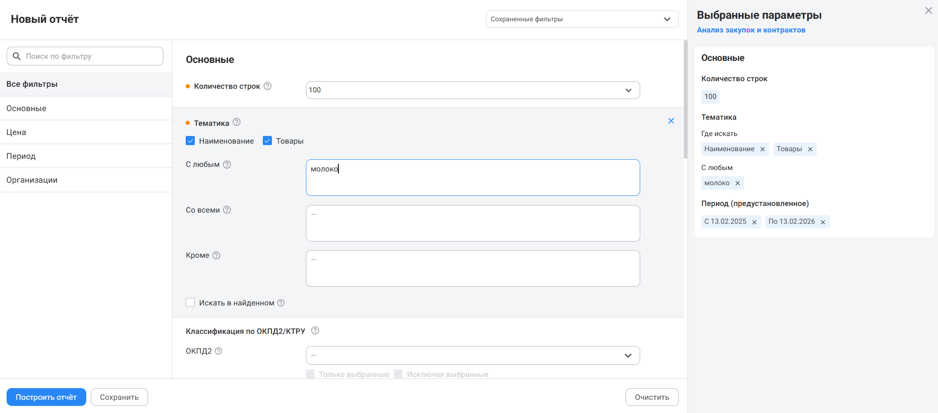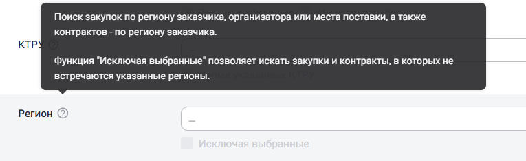 В фильтре доступно несколько базовых параметров поиска: тематика, классификация по ОКПД2/КТРУ, регион, тип, цена, период, заказчик и участник/победитель/поставщик. Каждый из них ведет параллельный (т.е. независимый) поиск по закупкам и контрактам. У каждого поля есть подсказка о том, что именно учитывается в поиске. Например, для фильтра «Регион» при поиске закупок учитываются регионы заказчика, организатора и места поставки, а при поиске контрактов – регион заказчика.