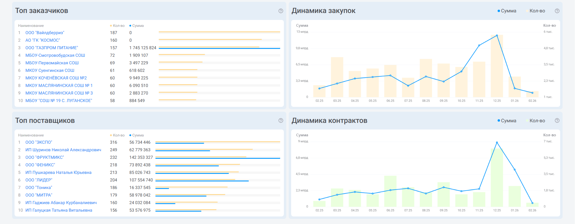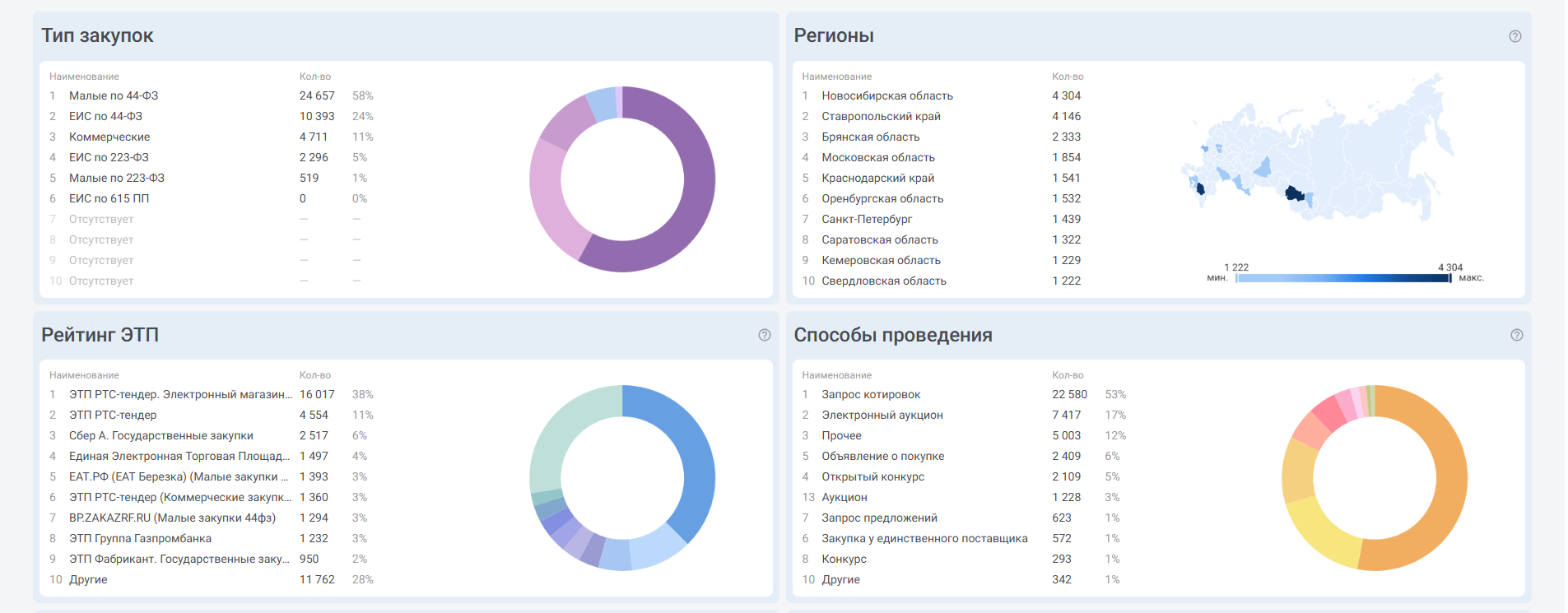 Диаграммы: по типам закупок, регионам, способам проведения, ЭТП, заказчикам и поставщикам, а также динамика закупок и контрактов