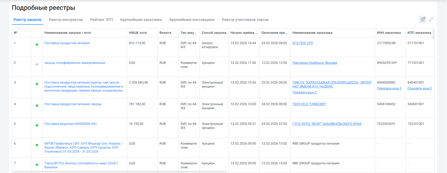 6 подробных реестров: по закупкам, контрактам, ЭТП, заказчикам, участникам и поставщикам