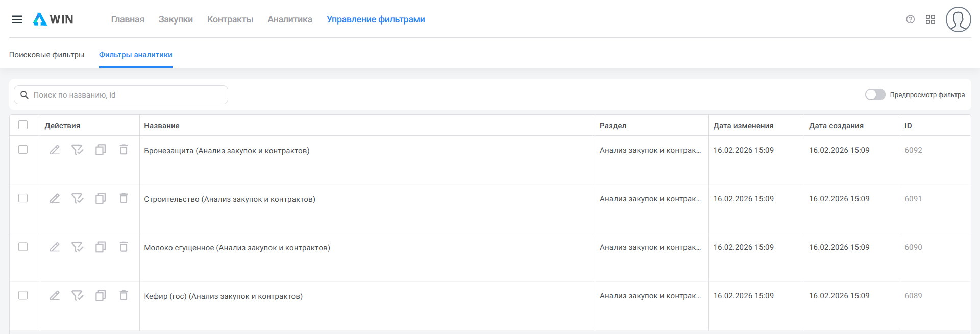 Сохраненные фильтры, которые вы используете для построения аналитических отчётов, отображаются в разделе «Управление фильтрами» в отдельном подразделе «Фильтры аналитики». Здесь вы можете их редактировать и удалять.